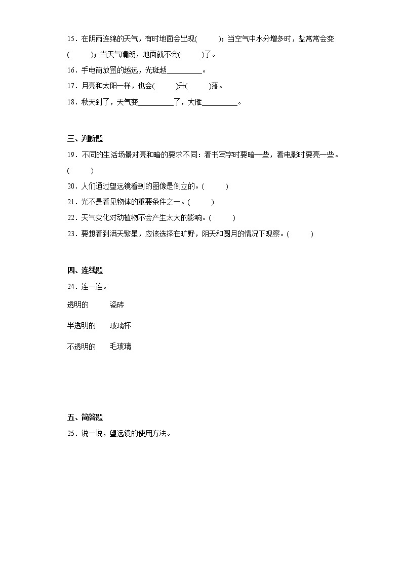 15.在阴雨连绵的天气,有时地面会出现( );当空气中水分增多时,盐常常会变( );当天气晴朗,地面就不会( )了。