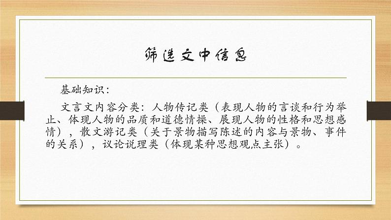 基础知识:文言文内容分类:人物传记类(表现人物的言谈和行为举止、体现人物的品质和道德情操、展现人物的性格和思想感情),散文游记类(关于景物描写陈述的内容与景物、事件的关系),议论说理类(体现某种思想观点主张)。