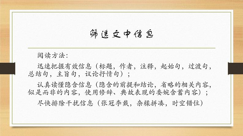 阅读方法:迅速把握有效信息(标题,作者,注释,起始句,过渡句,总结句,主旨句,议论抒情句);认真读懂隐含信息(隐含的前提和结论,省略的相关内容,似是而非的内容,使用修辞、典故表现的委婉含蓄内容);尽快排除干扰信息(张冠李戴,杂糅拼凑,时空错位)
