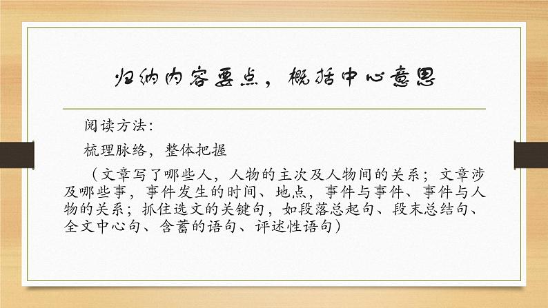 阅读方法:梳理脉络,整体把握(文章写了哪些人,人物的主次及人物间的关系;文章涉及哪些事,事件发生的时间、地点,事件与事件、事件与人物的关系;抓住选文的关键句,如段落总起句、段末总结句、全文中心句、含蓄的语句、评述性语句)