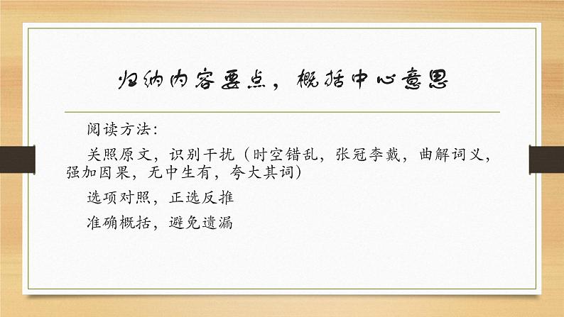 阅读方法:关照原文,识别干扰(时空错乱,张冠李戴,曲解词义,强加因果,无中生有,夸大其词)选项对照,正选反推准确概括,避免遗漏