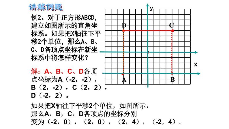 例2、对于正方形ABCD,建立如图所示的直角坐标系。如果把X轴往下平移2个单位,那么A、B、C、D各顶点坐标在新坐标系中将怎样变化?