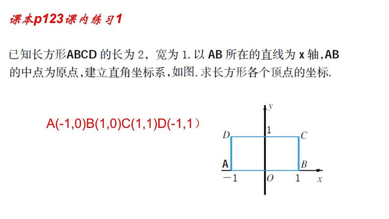 例2、对于正方形ABCD,建立如图所示的直角坐标系。(写出其坐标)