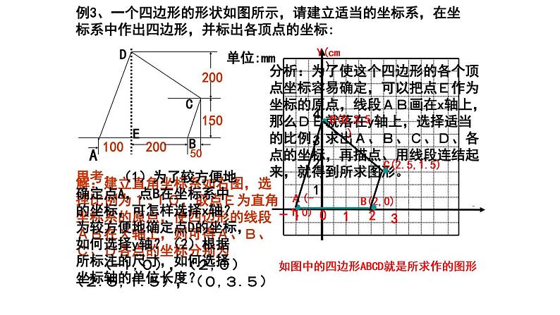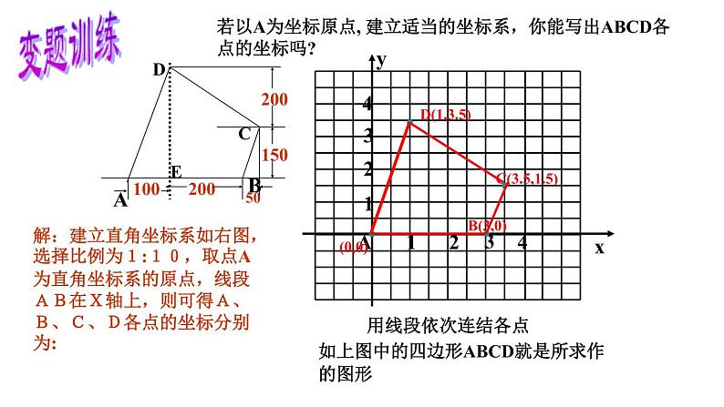 分析:为了使这个四边形的各个顶点坐标容易确定,可以把点E作为坐标的原点,线段AB画在x轴上,那么DE就落在y轴上,选择适当的比例,求出A、B、C、D、各点的坐标,再描点、用线段连结起来,就得到所求图形。