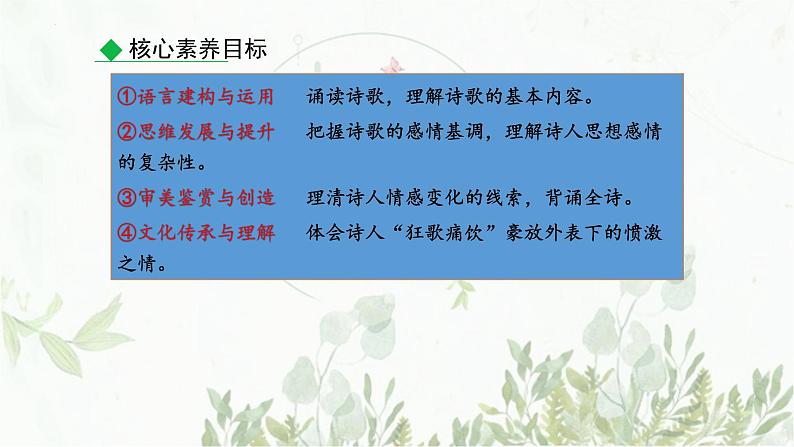 展开①语言建构与运用 诵读诗歌,理解诗歌的基本内容。②思维发展与提升 把握诗歌的感情基调,理解诗人思想感情的复杂性。③审美鉴赏与创造 理清诗人情感变化的线索,背诵全诗。④文化传承与理解 体会诗人“狂歌痛饮”豪放外表下的愤激之情。
