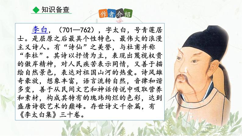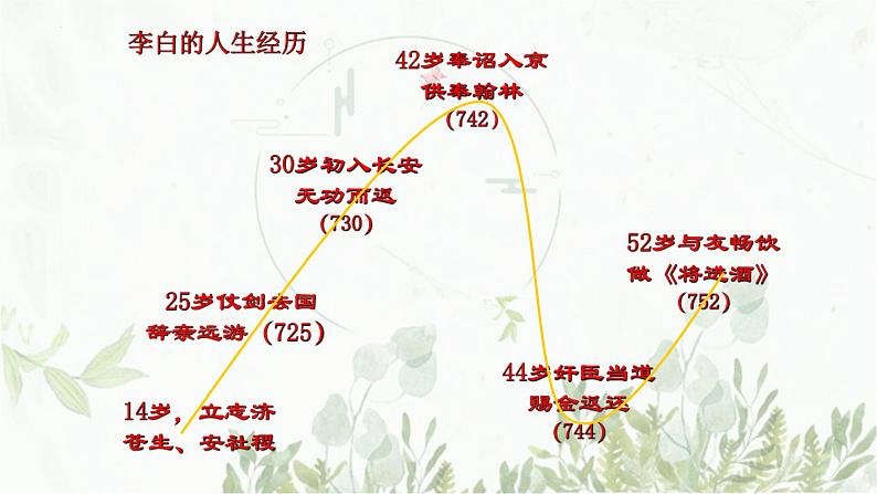 高中语文人教统编版选择性必修 上册将进酒图片课件ppt: 这是一份高中语文人教统编版选择性必修 上册将进酒图片课件ppt,共31页。PPT课件主要包含了作者简介,青莲居士,浪漫主义,奔放飘逸,想象丰富,豪迈瑰丽,第一次漫游,第二次漫游,人生经历,将进酒等内容,欢迎下载使用。