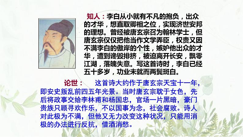 知人:李白从小就有不凡的抱负,出众的才华,想直取卿相之位,实现济世安邦的理想。曾经被唐玄宗召为翰林学士,但唐玄宗仅仅把他当作文学弄臣,权贵又因不满李白的傲岸的个性,嫉妒他出众的才华,遭到谗毁排挤,被迫离开长安,飘零江湖,落魄失意。写这首诗时,李白已经五十多岁,功业未就而两鬓斑白。
