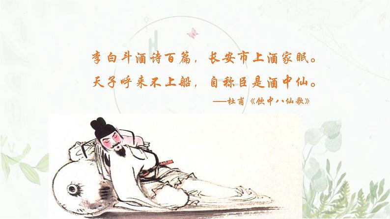 李白斗酒诗百篇,长安市上酒家眠。 天子呼来不上船,自称臣是酒中仙。 ——杜甫《饮中八仙歌》