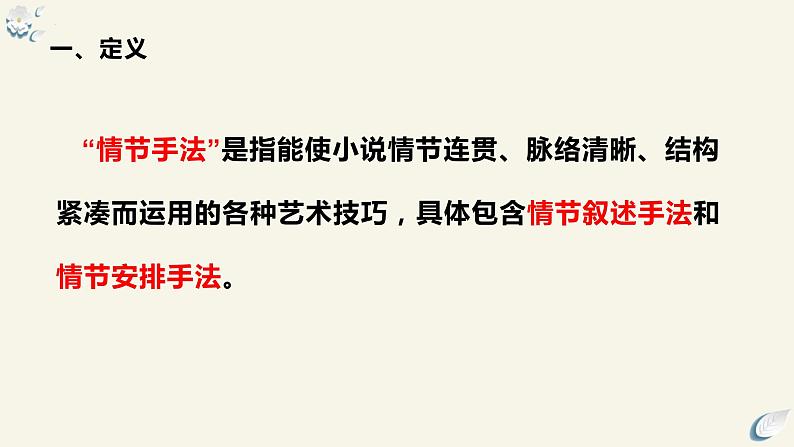 “情节手法”是指能使小说情节连贯、脉络清晰、结构紧凑而运用的各种艺术技巧,具体包含情节叙述手法和情节安排手法。