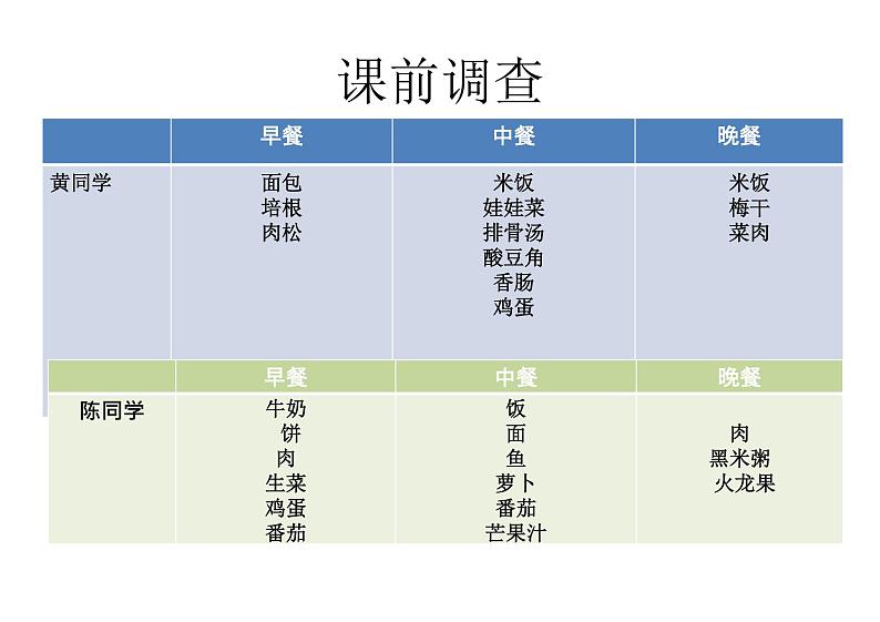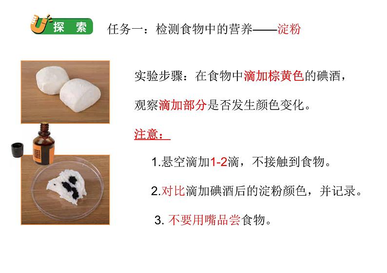 5. 食物中的营养教科版 四年级上册《呼吸与消化》单元多吃点蔬菜把鸡腿吃了饭不要剩下饭后要吃水果哦一天的食物会给我们的身体带来什么益处呢?课前调查食物中的营养糖类脂肪蛋白质维生素矿物质水豆类、肉类、水产类、蛋类、内脏油类、巧克力、鸡蛋、鸭蛋、花生、核桃、果仁、芝麻……主食、土豆、芋头、较甜水果……蔬菜、水果……食盐、海带、木耳……蔬菜、水果……任务一:检测食物中的营养——淀粉实验步骤:在食物中滴加棕黄色的碘酒,观察滴加部分是否发生颜色变化。注意: 1.悬空滴加1-2滴,不接触到食物。 2.对比滴加碘酒后的淀粉颜色,并记录。 3. 不要用嘴品尝食物。任务二:检测食物中的营养——脂肪实验步骤:1.用棉签在白纸上涂上食用油,观察油渍的样子。2.把食物放在白纸上挤压、滑动,观察白纸上留下的痕迹,并与油渍进行对比。注意: 1.花生米等需要去种皮。 2. 其他物体在白纸上多次按压、滚压。温馨提示:先检测淀粉后,后检测脂肪观察现象、记录,写发现。实验结束,把所有材料整理到盘子里,放回原位。找寻食物中的营养——蛋白质简易做法——烧,焦臭味初步判断,不是特别准确强调:大人陪同,注意安全查阅资料找寻食物中的营养——蛋白质专业做法:用双缩脲试剂检验蛋清中的蛋白质反应后,如果出现紫色,说明食物中含有蛋白质。(1) 取2ml蛋清稀释液和2ml双缩脲试剂A。(2) 将双缩脲试剂A和蛋清稀释液分别倒入同一试管中,振荡均匀。(3) 再往试管中加入3-4滴双缩脲试剂B,振荡均匀。一天的食物2.有没有一种食物包含所有的营养?1.是不是每种食物都包含多种营养?课后任务: 试着把一天中的食物表变成营养成分表。(或把一天中的食物记录表拿出来,并在相应的营养成分下打“√”)同学们,再见!