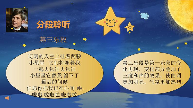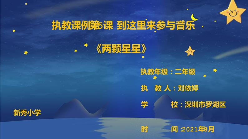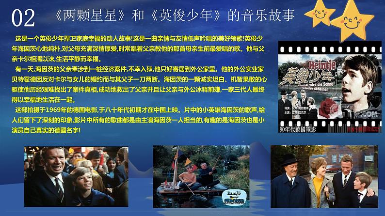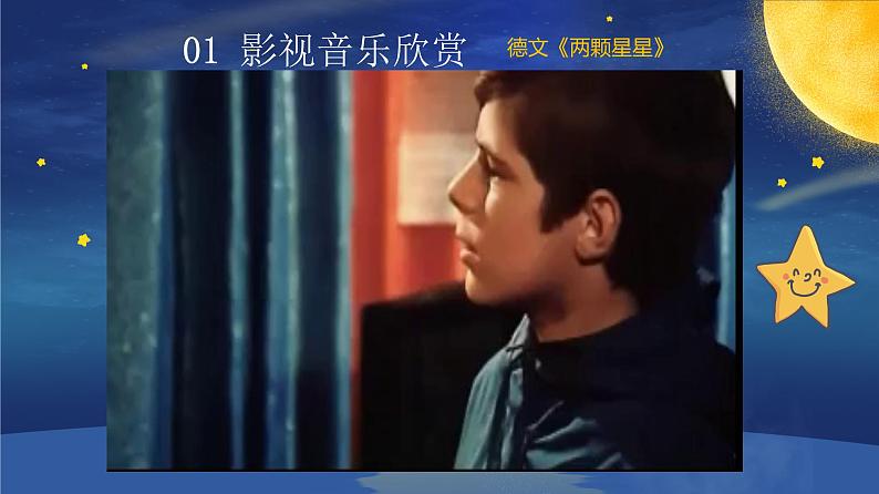 执教课例:第5课 到这里来参与音乐 《两颗星星》 执教年级:二年级 执 教 人:刘依婷 学 校:深圳市罗湖区新秀小学 时 间:2021年8月 1《两颗星星》和《英俊少年》的故事234目 录CONTENTS音乐欣赏《两颗星星》音乐手势游戏音乐拓展《小小少年》01 影视音乐欣赏德文《两颗星星》20XX20XX请替换文字内容请替换文字内容,修改文字内容,也可以直接复制你的内容到此。请替换文字内容,修改文字内容,也可以直接复制你的内容到此。请替换文字内容,修改文字内容,也可以直接复制你的内容到此。请替换文字内容,修改文字内容,也可以直接复制你的内容到此。请替换文字内容,修改文字内容,也可以直接复制你的内容到此。请替换文字内容,修改文字内容,也可以直接复制你的内容到此。请替换文字内容,修改文字内容,也可以直接复制你的内容到此。请替换文字内容,修改文字内容,也可以直接复制你的内容到此。请替换文字内容,修改文字内容,也可以直接复制你的内容到此。请替换文字内容,修改文字内容,也可以直接复制你的内容到此。请替换文字内容,修改文字内容,也可以直接复制你的内容到此。请替换文字内容,修改文字内容,也可以直接复制你的内容到此。请替换文字内容,修改文字内容,也可以直接复制你的内容到此。请替换文字内容,修改文字内容,也可以直接复制你的内容到此。请替换文字内容,修改文字内容,也可以直接复制你的内容到此。请替换文字内容,修改文字内容,也可以直接复制你的内容到此。《两颗星星》和《英俊少年》的音乐故事02 这是一个英俊少年捍卫家庭幸福的动人故事!这是一曲亲情与友情低声吟唱的美好领歌!英俊少年海因茨心地纯朴,对父母充满深情厚爱,时常唱着父亲教他的那首母亲生前最爱唱的歌。他与父亲卡尔相濡以沫,生活平静而幸福。 有一天,海因茨的父亲牵涉到一桩经济案件,不幸入狱,他只好寄居到外公家里。他的外公实业家贝特霍德因反对卡尔与女儿的婚约而与其父子一刀两断。海因茨的一颗诚实坦白、机智果敢的心驱使他历经艰难找出了案件真相,成功地救出了父亲并且让父亲与外公冰释前嫌,一家三代人最终得以幸福地生活在一起。 这部拍摄于1969年的德国电影,于八十年代初期才在中国上映。片中的小英雄海因茨的歌声,给人们留下了深刻的印象,影片中所有的歌曲都是由主演海因茨一人担当的,有趣的是海因茨也是小演员自己真实的德國名字!听一听,想一想歌曲的 情绪分段聆听第一乐段辽阔的天空上 挂着两颗星星 它们将随着我 一起去远征去远征 小星星它替我 留下了最后的问候 但愿你把我记在心间 旋律平稳有力,表现了主人公的坚定,自信。分段聆听第二乐段有个晚上 在窗户前我低声的问过你 你能不能不离开我 你对我眨眼睛旋律音调较低,柔缓抒情,犹如在徐徐诉说心事。分段聆听第三乐段辽阔的天空上挂着两颗小星星 它们将随着我 一起去远征去远征 小星星它替我 留下了 最后的问候 但愿你把我记在心间 啦啦啦 啦啦啦 啦啦啦 第三乐段是第一乐段的变化再现,变化部分叠加了三度和声的效果,使曲调更加明亮,气氛更加热烈。想一想,做一做请你把柯达伊手势与唱名连起来手势唱名03音乐手势游戏remifado03音乐手势游戏remifado音乐节拍游戏03分段聆听第三乐段音乐手势游戏03打手号,接龙唱同音反复使音乐更加坚定有力!音乐节拍游戏03分段聆听第三乐段音乐手势游戏03打手号,唱一唱04音乐拓展 欣赏《英俊少年》主题曲《小小少年》SUCCESS 通过今天对《英俊少年》电影的了解,歌曲《两颗星星》的学习,老师希望你们也能像海因茨那样积极乐观的面对所有的困难,并且让音乐成为你们生活中的一部分。用自己的智慧和爱心将困难克服掉,勇敢的迎接生活的挑战,做一个快乐向上的少年! 本教学ppt属于原创,仅供学习参考,版权归原作者所有,如有侵权请联系告之,将在规定时间内给予删除处理。