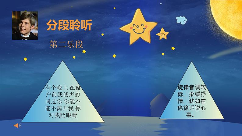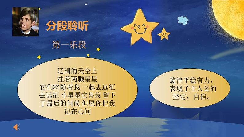这是一份小学音乐花城版二年级上册欣赏《两颗星星》试讲课ppt课件,文件包含花城版二年级上册音乐第5课《两颗星星》课件ppt、花城版二年级上册音乐-第5课《两颗星星》教案doc、lkxxpdbanmp3、lkxxpdcshbfmp3、lkxxpddyysmp3、lkxxpdfanmp3、lkxxpddypdwmv等7份课件配套教学资源,其中PPT共18页, 欢迎下载使用。