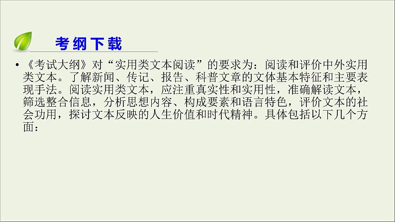 《考试大纲》对“实用类文本阅读”的要求为:阅读和评价中外实用类文本。了解新闻、传记、报告、科普文章的文体基本特征和主要表现手法。阅读实用类文本,应注重真实性和实用性,准确解读文本,筛选整合信息,分析思想内容、构成要素和语言特色,评价文本的社会功用,探讨文本反映的人生价值和时代精神。具体包括以下几个方面: