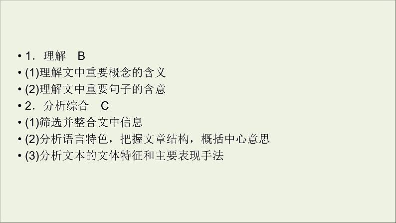 1.理解 B(1)理解文中重要概念的含义(2)理解文中重要句子的含意2.分析综合 C(1)筛选并整合文中信息(2)分析语言特色,把握文章结构,概括中心意思(3)分析文本的文体特征和主要表现手法