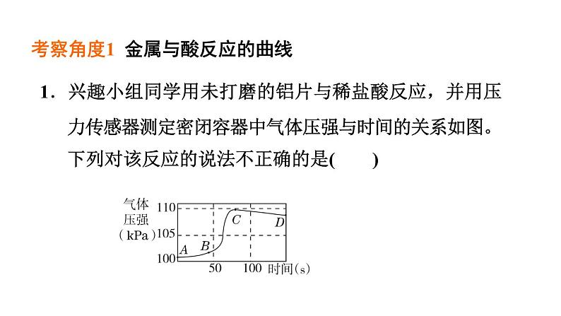 1.兴趣小组同学用未打磨的铝片与稀盐酸反应,并用压力传感器测定密闭容器中气体压强与时间的关系如图。下列对该反应的说法不正确的是( )
