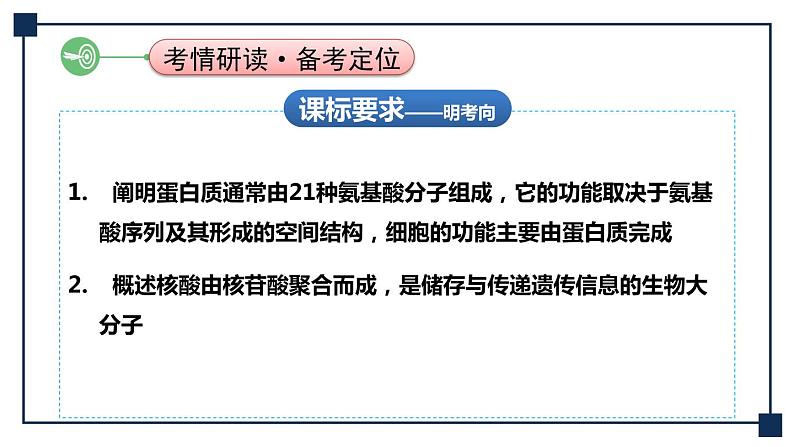阐明蛋白质通常由21种氨基酸分子组成,它的功能取决于氨基酸序列及其形成的空间结构,细胞的功能主要由蛋白质完成概述核酸由核苷酸聚合而成,是储存与传递遗传信息的生物大分子