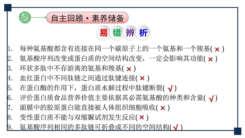 1.(必修1 P29)组成蛋白质的氨基酸的共同特点是每种氨基酸分子都至少含有一个氨基和一个羧基,并且都有一个氨基和一个羧基连接在同一个碳原子上。2.(必修1 P30)由肽键连接氨基酸分子形成肽链,又因氨基酸之间能够形成氢键等,从而使肽链能盘曲、折叠,形成具有一定空间结构的蛋白质分子。3.(必修1 P31)形成肽链的氨基酸的种类、数目、排列顺序不同,肽链的盘曲、折叠方式及其形成的空间结构千差万别,是蛋白质结构具有多样性的直接原因。