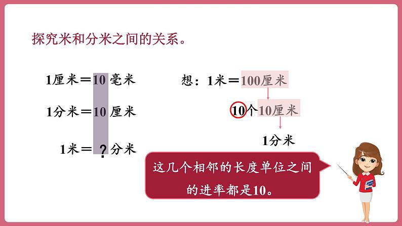 这是一份三年级上册毫米、分米的认识课文配套ppt课件,共18页。PPT课件主要包含了新课引入,认识分米,探究新知,分米=10厘米,厘米=10毫米,米=分米,想1米=100厘米,米10分米,巩固练习,填一填等内容,欢迎下载使用。