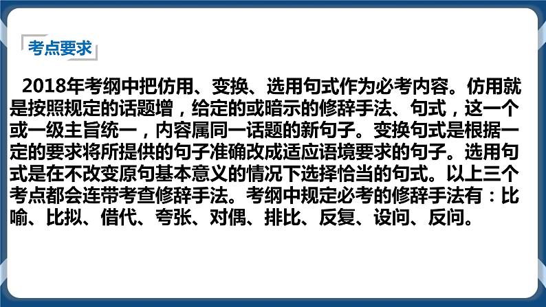 这是一份2023高考语文专题复习:变换句式课件PPT,共33页。PPT课件主要包含了长短句变换,指定句式压缩,下定义,整句与散句,表达效果等内容,欢迎下载使用。