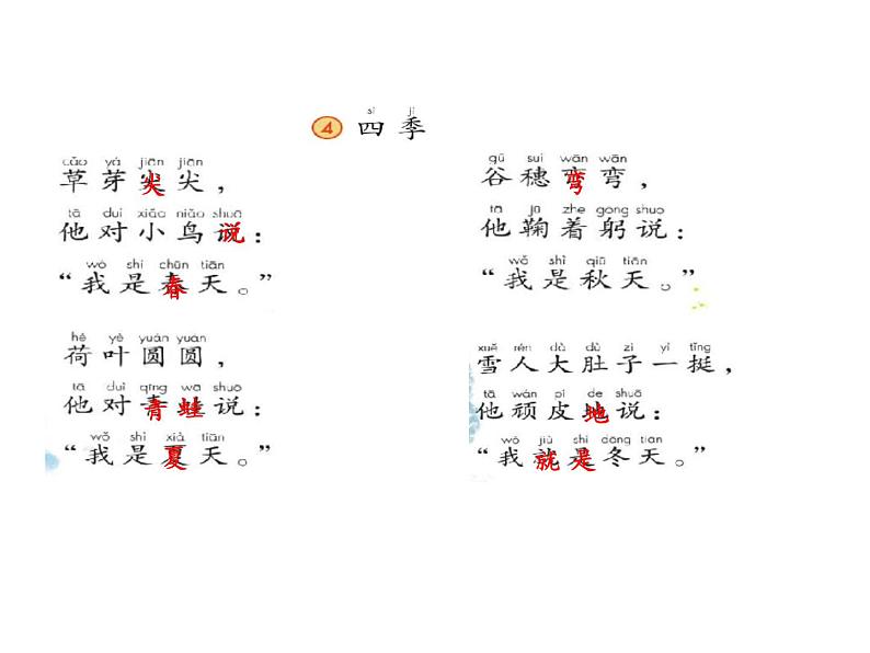 这是一份人教部编版一年级上册4 四季课前预习课件ppt,共49页。PPT课件主要包含了jiān尖,shuō说,chūn春,qīng青,wā蛙,xià夏,夏冬条,wān弯,de地,jiù就等内容,欢迎下载使用。