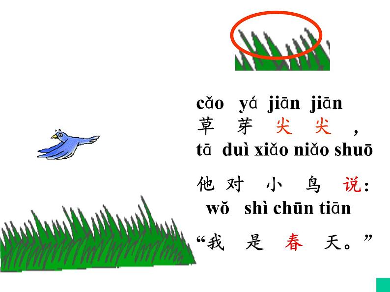 cǎ yá jiān jiān 草 芽 尖 尖 ,tā duì xiǎ niǎ shuō 他 对 小 鸟 说: wŏ shì chūn tiān “我 是 春 天。”