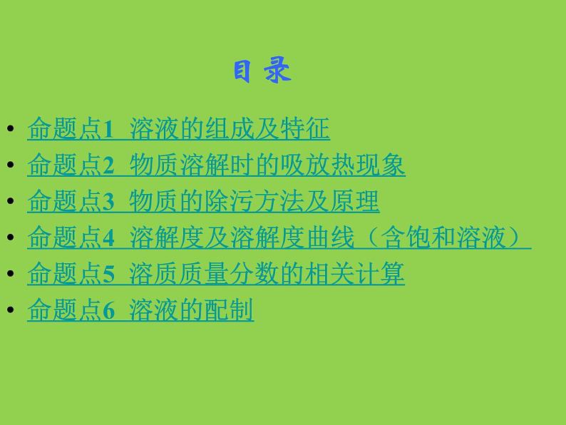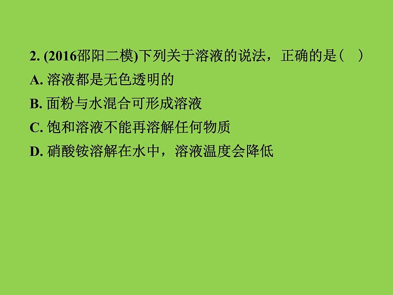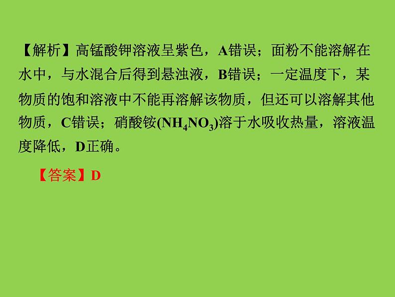 第一部分 教材知识梳理第九单元 溶液 目录命题点1 溶液的组成及特征命题点2 物质溶解时的吸放热现象命题点3 物质的除污方法及原理命题点4 溶解度及溶解度曲线(含饱和溶液)命题点5 溶质质量分数的相关计算命题点6 溶液的配制命题点1 溶液的组成及特征(2016年10考,2015年8考,2014年7考,2013年3考)均一稳定混合物均一稳定溶质溶剂溶质溶剂溶质溶剂溶剂想一想 均一、稳定、无色透明的液体一定是溶液吗?答:不一定。均一、稳定的液体可能是纯净物,如水;而溶液属于混合物;溶液不一定是无色的,如硫酸铜溶液呈蓝色。1. (2016青海)将少量下列物质分别放入水中,充分搅拌后,不能得到溶液的是( )A. 食盐 B. 蔗糖 C. 菜籽油 D. 酒精【解析】食盐、蔗糖、酒精放入水中都能形成均一、稳定的混合物,形成溶液;而菜籽油放入水中形成的是乳浊液,故选C。【答案】C2. (2016邵阳二模)下列关于溶液的说法,正确的是( )A. 溶液都是无色透明的B. 面粉与水混合可形成溶液C. 饱和溶液不能再溶解任何物质D. 硝酸铵溶解在水中,溶液温度会降低【解析】高锰酸钾溶液呈紫色,A错误;面粉不能溶解在水中,与水混合后得到悬浊液,B错误;一定温度下,某物质的饱和溶液中不能再溶解该物质,但还可以溶解其他物质,C错误;硝酸铵(NH4NO3)溶于水吸收热量,溶液温度降低,D正确。【答案】D1. (2015邵阳21题2分)“恒大冰泉”是来自长白山的天然矿泉水,判断“恒大冰泉”属于溶液的依据是( )①无色 ②混合物 ③化合物 ④均一性⑤稳定性A. ①②④ B. ②④⑤C. ①③⑤ D. ③④⑤【解析】“恒大冰泉”属于溶液的依据是“恒大冰泉”具有均一性、稳定性,属于混合物,无色不是判断是否属于溶液的依据,溶液不一定都是无色的,有些溶液是带有颜色的,如硫酸铜溶液是蓝色的,故选B。【答案】B2. (2014长沙10题3分)溶液在工业生产和科学研究中具有广泛的用途。下列关于溶液的说法正确的是( )A. 面粉与水混合一定能形成溶液B. 溶液都是无色透明的C. NH4NO3、 NaCl、 CaO三者分别溶于水,所得溶液的温度逐渐降低D. 溶液是由溶质和溶剂组成的混合物 【解析】面粉与水混合形成的是悬浊液,不是溶液,A错误;溶液不一定是无色透明的,如硫酸铜溶液是蓝色的,B错误;NH4NO3溶于水所得溶液温度降低,NaCl溶于水所得溶液温度变化不大,CaO溶于水并与水反应,所得溶液温度升高,C错误;溶液由溶质和溶剂组成,属于混合物,D正确。【答案】D3. (2014张家界23题4分)生理盐水是医疗上常用的一种溶液,合格的生理盐水是无色透明的。一瓶合格的生理盐水密封放置一段时间后,_____(填“会”或者“不会”)出现浑浊现象,其理由是溶液具有________。不会稳定性【解析】溶液具有稳定性,只要外界条件不改变,水分不蒸发,溶质不分离出来,溶液就不会出现浑浊现象。命题点2 物质溶解时的吸放热现象(2016年6考,2015年3考,2014年6考,2013年3考)【特别提醒】如果物质在密闭容器中溶解,则溶解时吸收或放出的热量通常导致压强发生变化。 1. (2016眉山)如图所示,向盛有水的试管中加入某物质后,U形管B液面降低了一些,A液面上升了一些,则加入的物质是( )A. 烧碱B. 硝酸铵C. 食盐D. 生石灰【解析】U形管B液面降低,说明锥形瓶内压强减小,原因是试管吸热,导致锥形瓶内气体温度降低,压强减小。烧碱(NaOH)和生石灰(CaO)溶于水放出大量的热;食盐(NaCl)溶于水,吸放热现象不明显;硝酸铵溶于水吸热,故选B。【答案】B1. (2016永州13题2分)在装有水的烧杯中分别加入以下物质,其中形成的溶液温度降低的是( )A. 生石灰 B. 氢氧化钠C. 氯化钠 D. 硝酸铵【解析】生石灰和水反应放热,氢氧化钠溶于水放热,氯化钠溶于水温度基本不变,硝酸铵溶于水后溶液的温度降低,故选D。【答案】D2. (2014娄底8题2分)在盛有水的烧杯中加入以下某种物质,形成溶液的过程中,温度明显升高。这种物质可能是( )A. 氯化钠 B. 氢氧化钠C. 硝酸铵 D. 蔗糖【解析】氯化钠、蔗糖溶于水,溶液温度无明显变化;氢氧化钠溶于水放热,溶液温度升高;硝酸铵溶于水吸热,溶液温度降低,故选B。【答案】B3. (2015益阳20题4分)如图所示,广口瓶中盛有少量饱和澄清石灰水,小试管和U形管中均有适量水,现向小试管中注入适量浓硫酸。请回答:(1)可观察到饱和澄清石灰水________。(2)U形管中a、b液面变化情况是____(填序号)。A. a液面上升,b液面下降 B. a液面下降,b液面上升变浑浊B【解析】小试管进行的相当于浓硫酸的稀释,浓硫酸在稀释时会放出热量,而广口瓶内盛装的是澄清的石灰水,氢氧化钙的溶解度随温度的升高而降低,因此会变浑浊。由于瓶内温度升高,瓶内气体受热膨胀,U形管内的液面就会出现a液面下降,b液面上升。命题点3 物质的除污方法及原理(2016年5考,2015年7考,2014年1考,2013年5考)1. (2015郴州12题2分)下列利用了乳化原理的是( )A. 用汽油除去衣服上的油污B. 用稀硫酸除去铁锈C. 用洗洁精除去餐具上的油污D. 用盐酸除去水垢【解析】用汽油清洗油污是利用汽油的溶解作用,而不是乳化作用,A错误;用稀硫酸清除铁锈是利用稀硫酸能和铁锈反应,不是乳化作用,B错误;用洗洁精清洗餐具上的油污是利用了洗涤剂对油污的乳化作用,C正确;盐酸除去水垢,是盐酸和水垢反应,D错误。故选C。【答案】C2. (2016郴州12题2分)溶液在生活、生产中有广泛的应用。下列有关溶液的叙述正确的是( )A. 均一稳定的液体一定是溶液B. 