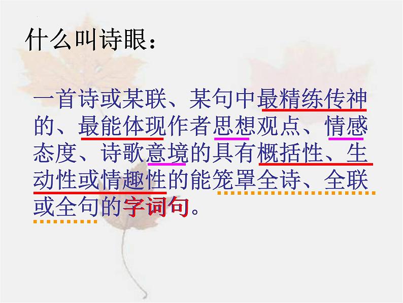 一首诗或某联、某句中最精练传神的、最能体现作者思想观点、情感态度、诗歌意境的具有概括性、生动性或情趣性的能笼罩全诗、全联或全句的字词句。