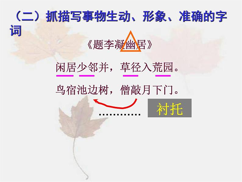 2、解答分析:古诗非常讲究构思,往往一个词或一个句子就构成全诗的线索,全诗的感情基调、全诗的思想,抓住这个词句命题往往可以以小见大,考出考生对全诗的把握程度。