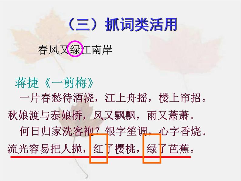 苏小妹与哥哥苏东坡和朋友黄庭坚一起玩吟诗游戏,苏小妹出了个对子要两位诗人填上两个字,把诗写完整,并能表达意境。这两句就是: 轻 风( )细 柳 ,淡 月( )梅 花 请同学们也学着填填看?A摇,映 B舞,隐 C扶,失鉴赏:“扶”拟人,绵绵情意,纤弱姿态。“失”月色朦胧,若隐若现,十分传神。例:雾失楼台,月迷津渡( 《踏莎行》秦观)又如:雾失楼台,月迷津度 (《踏莎行》 北宋·秦观 )漫天迷雾隐去了楼台,月色朦胧中,渡口显得迷茫难辨。“雾失楼台,月迷津渡。”互文见义 首要的是炼动词,其次是一些活用的形容词,或表达心理状态的词句中的位置主要是句子的谓语
