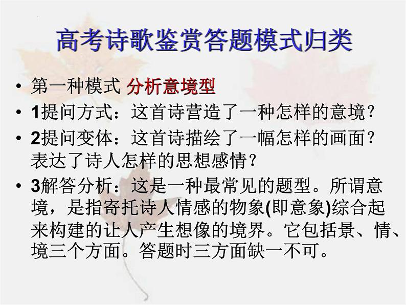 第一种模式 分析意境型1提问方式:这首诗营造了一种怎样的意境?2提问变体:这首诗描绘了一幅怎样的画面?表达了诗人怎样的思想感情?3解答分析:这是一种最常见的题型。所谓意境,是指寄托诗人情感的物象(即意象)综合起来构建的让人产生想像的境界。它包括景、情、境三个方面。答题时三方面缺一不可。