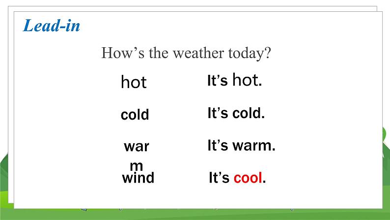 小学英语Lesson 11 How's the Weather Today?精品ppt课件: 这是一份小学英语Lesson 11 How's the Weather Today?精品ppt课件,文件包含Lesson11How’stheWeatherToday课件pptx、Lesson11How’stheWeatherToday教案doc、25wmv、windywav、weatherwav、warmwav、sunnywav、howwav、coolwav、cloudywav、27wav、27-3wav、27-4wav、27-2wav、27-1wav、26-2wav、26-1wav、26-1-5wav、26-1-4wav、26-1-3wav、26-1-2wav、26-1-1wav、26-2wmv等23份课件配套教学资源,其中PPT共32页, 欢迎下载使用。