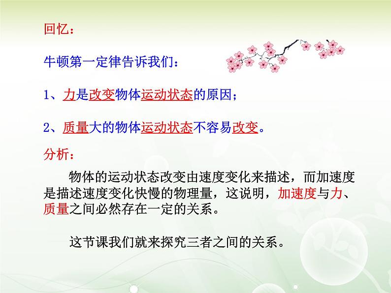 分析: 物体的运动状态改变由速度变化来描述,而加速度是描述速度变化快慢的物理量,这说明,加速度与力、质量之间必然存在一定的关系。