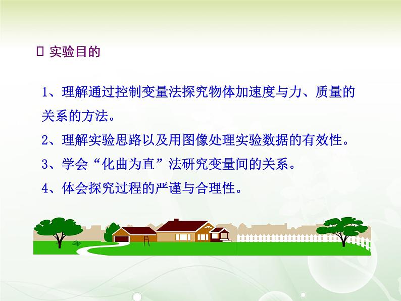 1、理解通过控制变量法探究物体加速度与力、质量的关系的方法。2、理解实验思路以及用图像处理实验数据的有效性。3、学会“化曲为直”法研究变量间的关系。 4、体会探究过程的严谨与合理性。