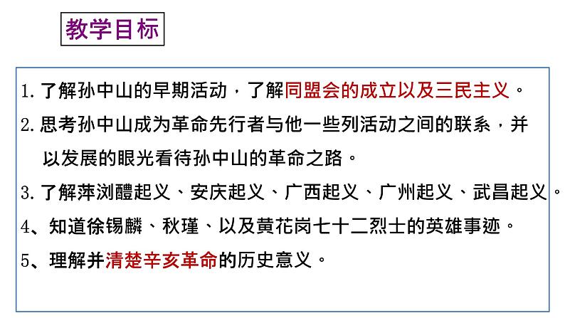 1.了解孙中山的早期活动,了解同盟会的成立以及三民主义。2.思考孙中山成为革命先行者与他一些列活动之间的联系,并以发展的眼光看待孙中山的革命之路。3.了解萍浏醴起义、安庆起义、广西起义、广州起义、武昌起义。4、知道徐锡麟、秋瑾、以及黄花岗七十二烈士的英雄事迹。5、理解并清楚辛亥革命的历史意义。