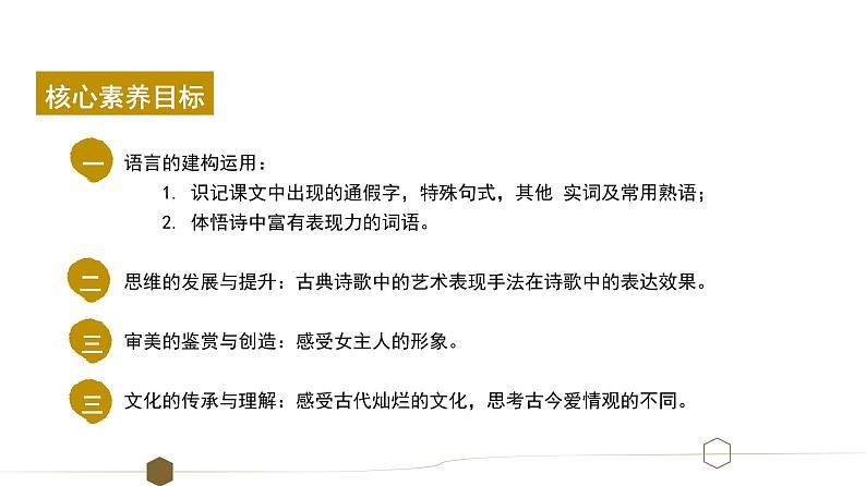 展开语言的建构运用: 1. 识记课文中出现的通假字,特殊句式,其他 实词及常用熟语; 2. 体悟诗中富有表现力的词语。思维的发展与提升:古典诗歌中的艺术表现手法在诗歌中的表达效果。审美的鉴赏与创造:感受女主人的形象。文化的传承与理解:感受古代灿烂的文化,思考古今爱情观的不同。