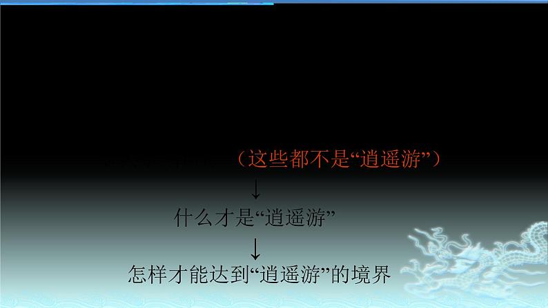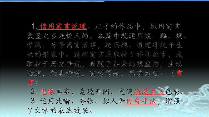 【课文写作特色】1. 借用寓言说理。庄子的作品中,运用寓言数量之多是惊人的。本篇中就运用鲲、鹏、蜩、学鸠、斥等寓言故事,把思想、道理寄托于生动的形象中。这些寓言或取材于神话故事,或取材于历史传说,或随手拈来幻想虚构,生动活泼,颇具诗意,寓意隽永,感染力强。(重言)2. 想像丰富,意境开阔,充满浪漫主义色彩。3. 运用比喻、夸张、拟人等修辞手法,增强了文章的表达效果。