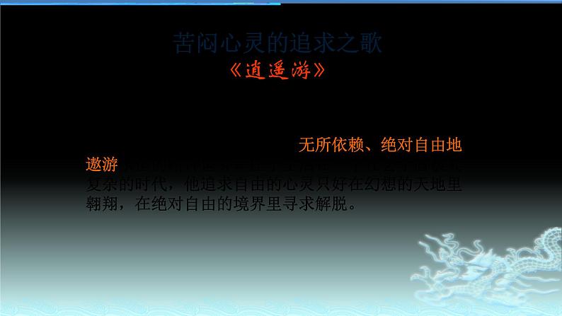 《逍遥游》 是《庄子》中的代表作品,列于《内篇》之首。逍遥游的意思,是指无所依赖、绝对自由地遨游永恒的精神世界。庄子生活在一个社会矛盾极其复杂的时代,他追求自由的心灵只好在幻想的天地里翱翔,在绝对自由的境界里寻求解脱。