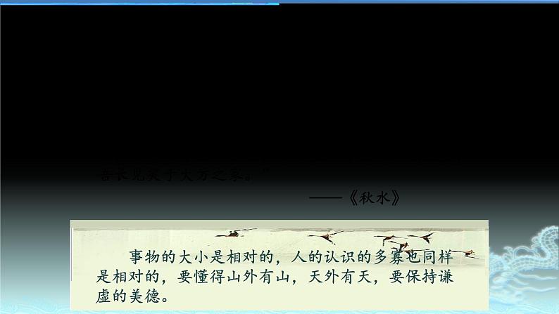 秋水时至,百川灌河;泾流之大,两涘渚崖之间不辩牛马。于是焉河伯欣然自喜,以天下之美为尽在己,顺流而东行,至于北海,东面而视,不见水端。河伯始旋其面目,望洋向若而叹曰:“野语有之曰:‘闻道百,以为莫己若者。’我之谓也。且夫我尝闻少仲尼之闻,而轻伯夷之义者,始吾弗信,今吾睹子之难穷也,吾非至于子之门,则殆矣,吾长见笑于大方之家。” ——《秋水》