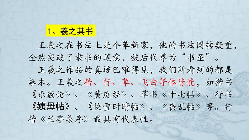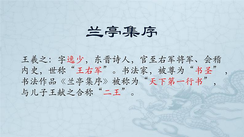 王羲之:字逸少,东晋诗人,官至右军将军、会稽内史,世称“王右军”。书法家,被尊为“书圣” ,书法作品《兰亭集序》被称为“天下第一行书”,与儿子王献之合称“二王”。