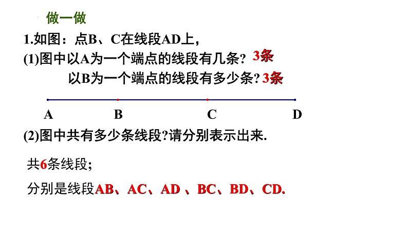 1.如图:点B、C在线段AD上,(1)图中以A为一个端点的线段有几条? 以B为一个端点的线段有多少条?