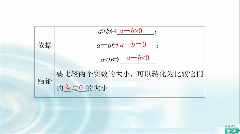 依据 | a>b⇔a-b>0; a=b⇔a-b=0; a<b⇔a-b<0 |