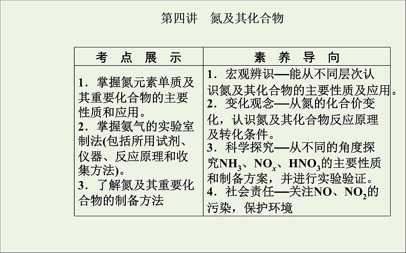 高考化学一轮复习第4章非金属及其化合物第4节氮及其化合物课件: 这是一份高考化学一轮复习第4章非金属及其化合物第4节氮及其化合物课件,共60页。PPT课件主要包含了必备知识·关键能力,考点一考点二,热点聚焦·考能提升,热点10热点11,真题验收·新题预测,真题验收新题预测等内容,欢迎下载使用。