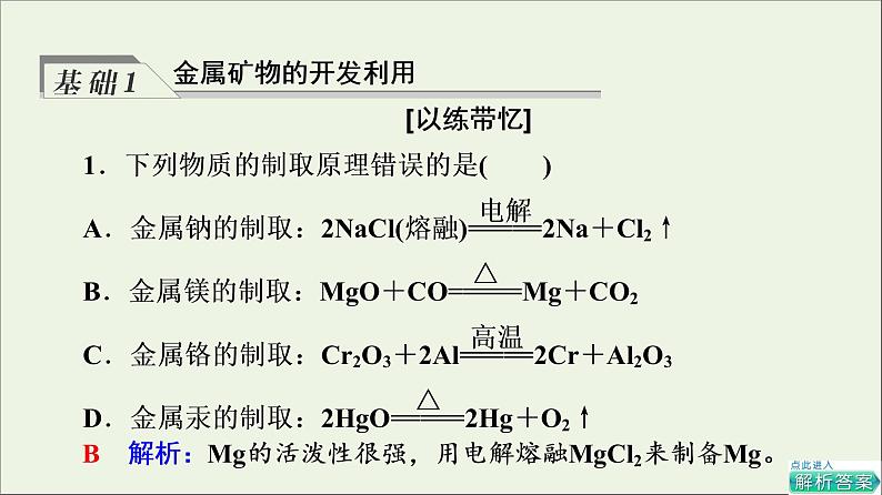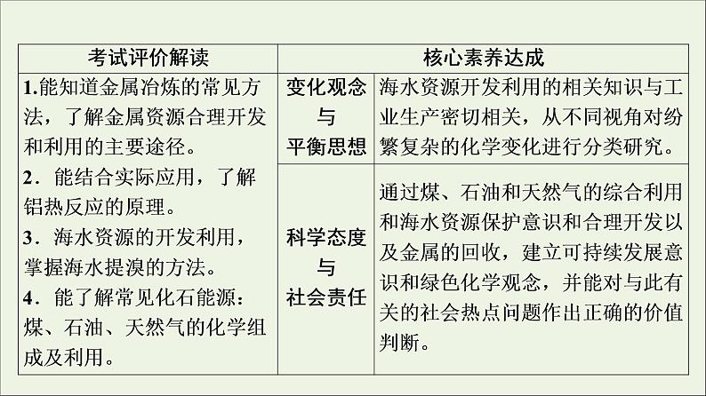 第一节 自然资源的开发利用第六章 化学与可持续发展01环节1 课前自主复习基础1 金属矿物的开发利用基础2 海水资源的开发利用基础3 煤、石油和天然气的综合利用化合态 游离态 2Hg+O2↑ 2Fe+3CO2 W+3H2O 3Mn+2Al2O3 4Al+3O2↑ Mg+Cl2↑ 2Na+Cl2↑ 海水 粗盐 饱和食盐水 Cl2 H2、NaOH 2NaBr+Cl2===2NaCl+Br2 Br2+SO2+2H2O===2HBr+H2SO4 2HBr+Cl2===2HCl+Br2 Cl2+2I-===I2+2Cl- 有机物 无机物 隔绝空气加强热使其分解 甲烷 碳氢化合物 化学 02环节2 新情境专项练