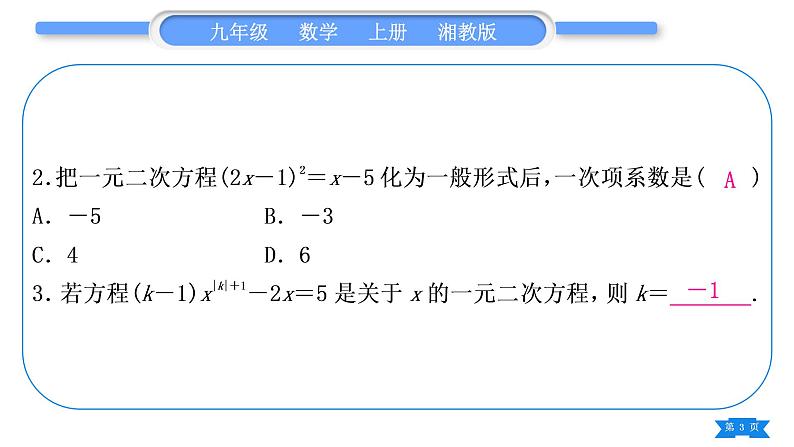 这是一份湘教版九年级上册第2章 一元二次方程综合与测试习题课件ppt,共24页。PPT课件主要包含了x1=3x2=2等内容,欢迎下载使用。