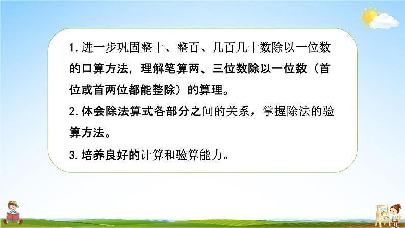 练习七(2)第 5 课时苏教版 数学 三年级 上册进一步巩固整十、整百、几百几十数除以一位数 的口算方法,理解笔算两、三位数除以一位数(首 位或首两位都能整除)的算理。体会除法算式各部分之间的关系,掌握除法的验 算方法。培养良好的计算和验算能力。1.最大的三位数除以3,商是( 333)。2.算式( )÷( )= 12……2中除数最小是( 3 ),这时被除数 是( 38 )。3.65÷3=( 21 )……( 2 )1直接写出得数。22÷2=1136÷3=1290÷9=1039÷3=1368÷2=3488÷4=2284÷4=2177÷7=112口算下面各题。先估计商是几百多,再用竖式计算。2 2 2 62226604 8 8 9888981一百多 226÷2= 1131 1 3二百多 889÷4=222……12 2 232 6 8 36883213 9 3 5933532三百多 683÷2= 341……13 4 1三百多 935÷3= 311……23 1 13先估计商是几百多,再用竖式计算。48÷4=12(人)48÷2=24(张)答:每组有12人,这个班需要24张双人课桌。4三年级一班有48人,平均分成4组,每组有多少人?这个班需要多少 张双人课桌?9696÷3=32(人)答:平均每辆车坐32人。548-15=33(个)33÷3=11(个)答:每个班分得11个。67 拓展题:小宇和妈妈去外婆家,买两张火车票一共用去96元。小宇的火车 票票价是妈妈的一半,小宇的火车票票价是多少元?怎么理解“小宇的火车票票价 是妈妈的一半”?你能用线段图表示 出题目的意思吗?小宇:妈妈:96元7 拓展题:小宇和妈妈去外婆家,买两张火车票一共用去96元。小宇的火车 票票价是妈妈的一半,小宇的火车票票价是多少元?96÷3= 32(元)答:小宇的火车票票价是32元。7 拓展题:小宇和妈妈去外婆家,买两张火车票一共用去96元。小宇的火车 票票价是妈妈的一半,小宇的火车票票价是多少元?笔算三位数除以一位数时,要从被除数的最 高位除起,然后一位一位地除,每次只能落 下一个数字,而且余数要小于除数。在和倍问题中,两数之和÷(倍数+1)=1份 数,1份数×倍数=几份数。这节课你有什么收获?谢谢观看Thank You