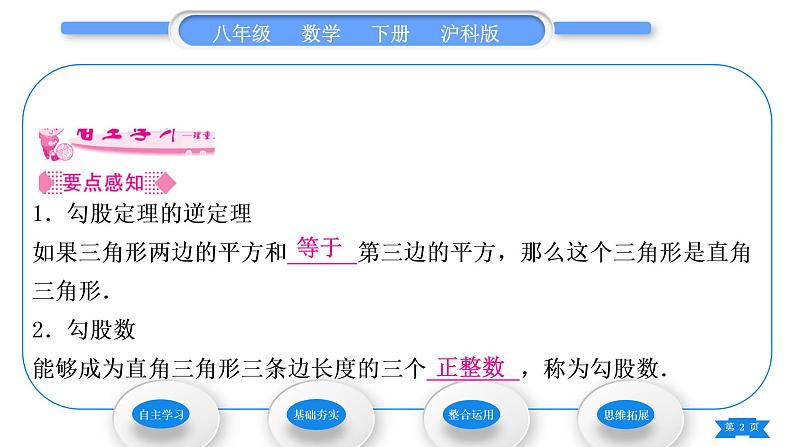 沪科版八年级下册18.2 勾股定理的逆定理获奖ppt课件: 这是一份沪科版八年级下册18.2 勾股定理的逆定理获奖ppt课件,共27页。PPT课件主要包含了回顾与思考,勾股定理,勾股定理的逆定理,快速填一填,解根据题意得,练一练,解连接AC,用到了方程的思想等内容,欢迎下载使用。