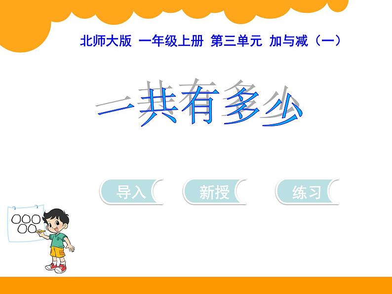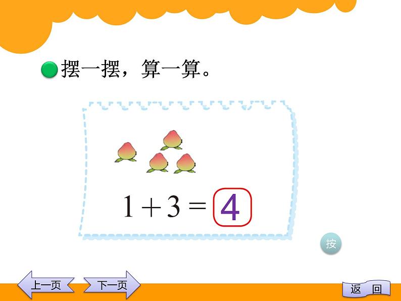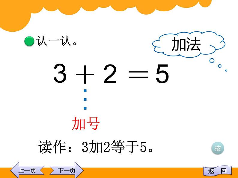 北师大版 一年级上册 第三单元 加与减(一)一共有多少导入新授练习下一页 上一页返 回下一页 上一页返 回按下一页 上一页返 回按下一页 上一页返 回按下一页 上一页返 回按3+2=5…加号读作:3加2等于5。加法下一页 上一页返 回按4下一页 上一页返 回按24下一页 上一页返 回按415下一页 上一页返 回按235下一页 上一页返 回按224下一页 上一页返 回按235下一页 上一页返 回按下一页 上一页返 回按5314下一页 上一页返 回按213下一页 上一页返 回按下一页 上一页返 回按134325下一页 上一页返 回按下一页 上一页返 回按325123下一页 上一页返 回按下一页 上一页返 回按23571下一页 上一页返 回按上一页返 回