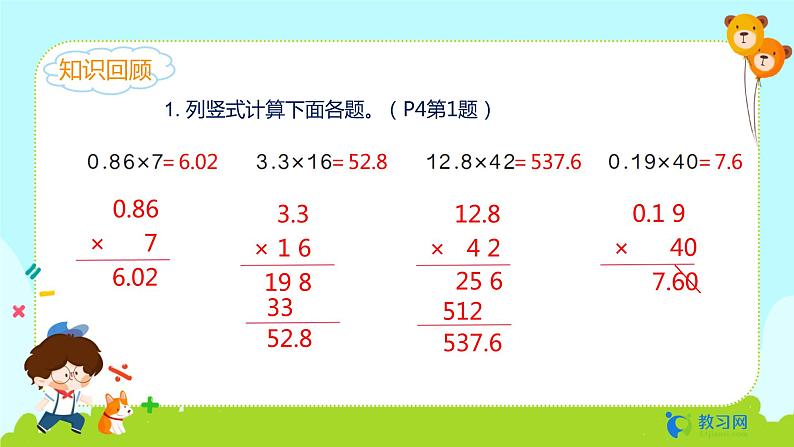 展开小数乘整数的计算方法:(1)按照整数乘法进行计算;(2)因数中有几位小数,就从积的右边起数出几位,点上小数点;(3)积的小数部分末尾的0可以去掉。