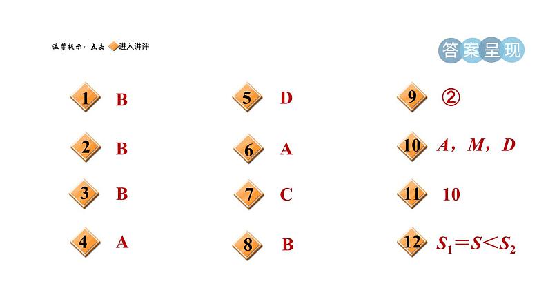 人教版 九年级下第二十九章 投影与视图测素质 投影与视图集训课堂 BBABBDA答 案 呈 现习题链接CS1=S<S2②A,M,D10习题链接在工程制图中,一般采用的投影方法是( ) A.中心投影 B.正投影C.斜投影 D.都有可能B1一、选择题(每题3分,共24分)B2唐代李白《日出行》云:“日出东方隈,似从地底来”,描述的是看日出的景象,意思是太阳从东方升起,似从地底而来,如图所示,此时观测到地平线和太阳所成的视图可能是( )B3【中考·贺州】小明拿一个等边三角形木框在太阳下玩耍,发现等边三角形木框在地面上的投影不可能是( )A4【2021·济宁】一个圆柱体如图所示,下面关于它的左视图的说法,正确的是( )A.既是轴对称图形,又是中心对称图形B.既不是轴对称图形,又不是中心对称图形C.是轴对称图形,但不是中心对称图形D.是中心对称图形,但不是轴对称图形5【教材P99练习变式】【中考·长沙】某几何体的三视图如图所示,该几何体是( )DA6【2022·武汉】如图是由4个相同的小正方体组成的几何体,它的主视图是( )C7一个圆锥的主视图是边长为6 cm的正三角形,则这个圆锥的侧面积等于( )A.36π cm2 B.24π cm2C.18π cm2 D.12π cm28【教材P110复习题T7变式】如图是一个几何体的三视图,其中主视图与左视图完全一样,则这个几何体的表面积是( )A.80-2π B.80+4πC.80 D.80+6π【点拨】由三视图可知,该几何体是长方体中间挖去一个圆柱,长方体的长、宽、高分别为4,4,3,圆柱的底面直径为2,高为3.∴这个几何体的表面积是4×4×2+4×3×4+2π×3-2×(2÷2)2π=80+4π.【答案】B②9将如图所示的Rt△ABC绕AB所在直线旋转一周,所得的几何体的主视图是图中的________(只填序号).二、填空题(每题5分,共20分)A,M,D10如图是某直三棱柱的表面展开图,请指出图中表示多面体的同一点的三个字母:____________.1011如图,当太阳光与地面上的树影成45°角时,树影投射在墙上的影高CD等于2米,若树根到墙的距离BC等于8米,则树高AB等于______米.S1=S<S212【中考·百色】如图,长方体的一个底面ABCD在投影面P上,M,N分别是侧棱BF,CG的中点,矩形EFGH与矩形EMNH的投影都是矩形ABCD,设它们的面积分别是S1,S2,S,则S1,S2,S的关系是________(用“= ”“>”或“