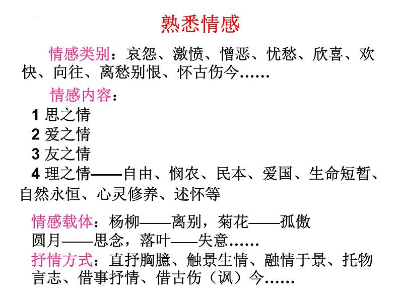情感载体:杨柳——离别,菊花——孤傲圆月——思念,落叶——失意……抒情方式:直抒胸臆、触景生情、融情于景、托物言志、借事抒情、借古伤(讽)今……